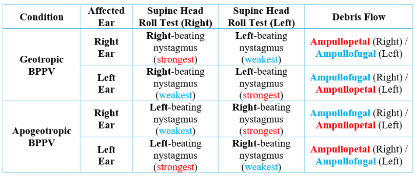 You use the Supine Head Roll Test to differentiate between geotropic and apogeotropic BPPV and determine the affected ear. The intensity of the nystagmus you observe tells you everything you need to know. The following table provides a quick guide to understanding which side is affected.