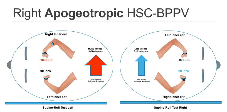 Please note: it is well understood that debris for apogeotropic HSC-BPPV can be in many places, including the short arm and periampullary regions on both sides of the cupula. In this example, we are treating the ampullary arm (anterior arm HSC-BPPV).
